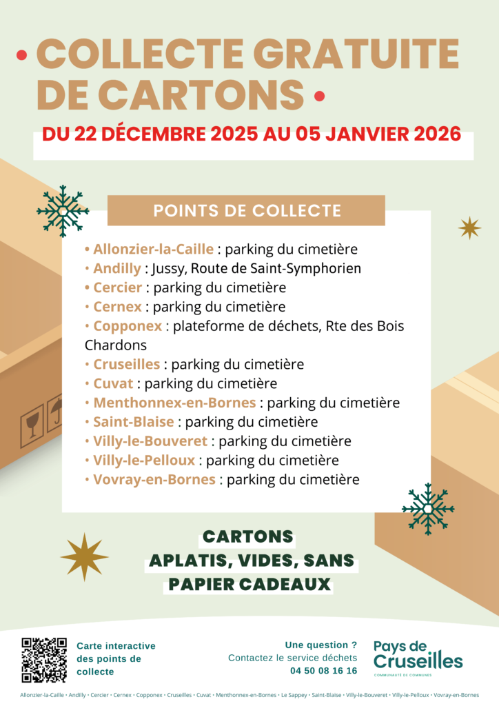 Comme chaque année à l’occasion des fêtes de fin d’année, la Communauté de Communes du Pays de Cruseilles met à disposition des communes des bennes spécifiques pour assurer la collecte de cartons et de sapins.