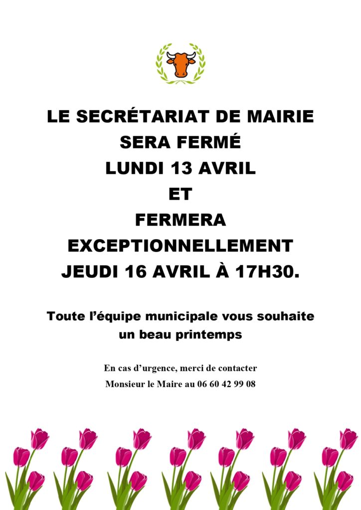 FERMETURE DU SECRÉTARIAT DE MAIRIE Le secrétariat de mairie sera fermé le lundi 13 avril et fermera exceptionnellement le jeudi 16 avril à17h30.
