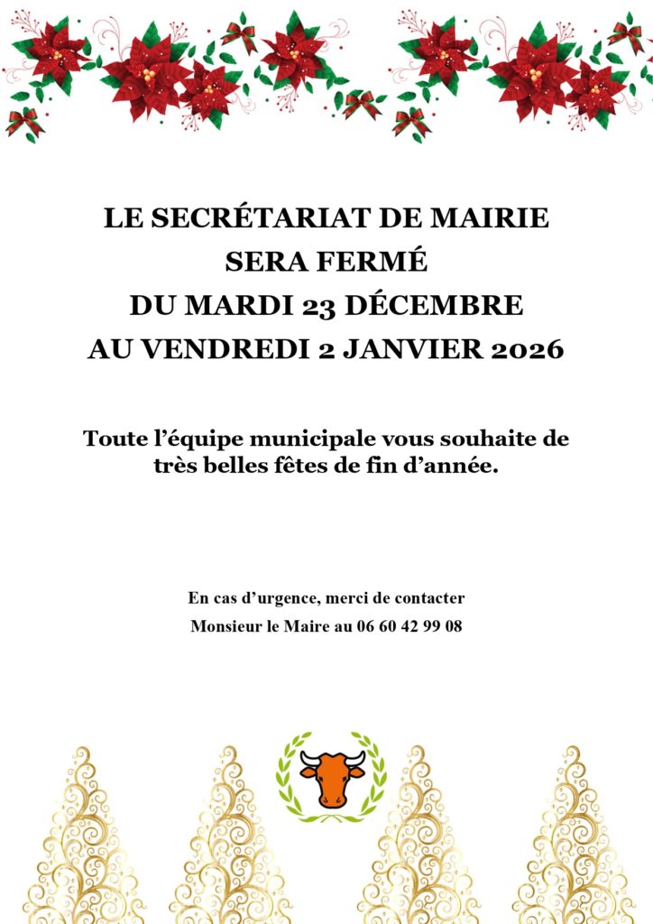 Fermeture du secrétariat de mairie Le secrétariat de la mairie sera fermée du mardi 23 décembre au vendredi 2 janvier inclus. Pour toutes urgences, vous pouvez contacter Monsieur le Maire.