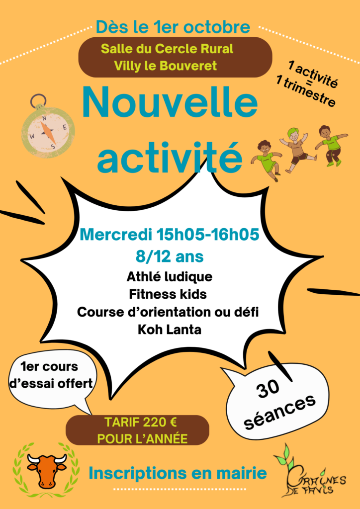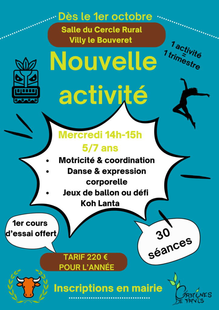 Deux nouvelles activités débutent mercredi 1er octobre pour les enfants de 5/7 ans et de 8/12 ans dans la salle du Cercle Rural.