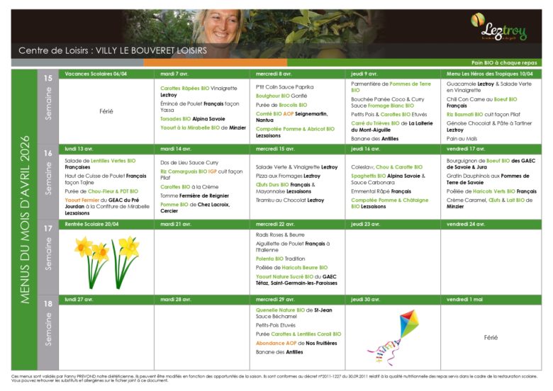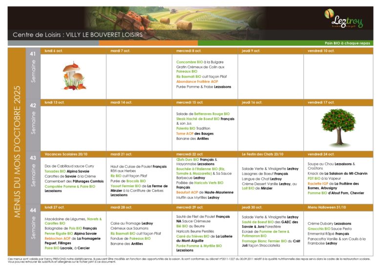 Le repas durant les vacances et les mercredis (1/2 journée matin ou journée complète) est obligatoire. Seul les enfants signalés comme allergiques auront la possibilité d’apporter leur repas. Le tarif de la journée sera alors défalqué du coût du repas.